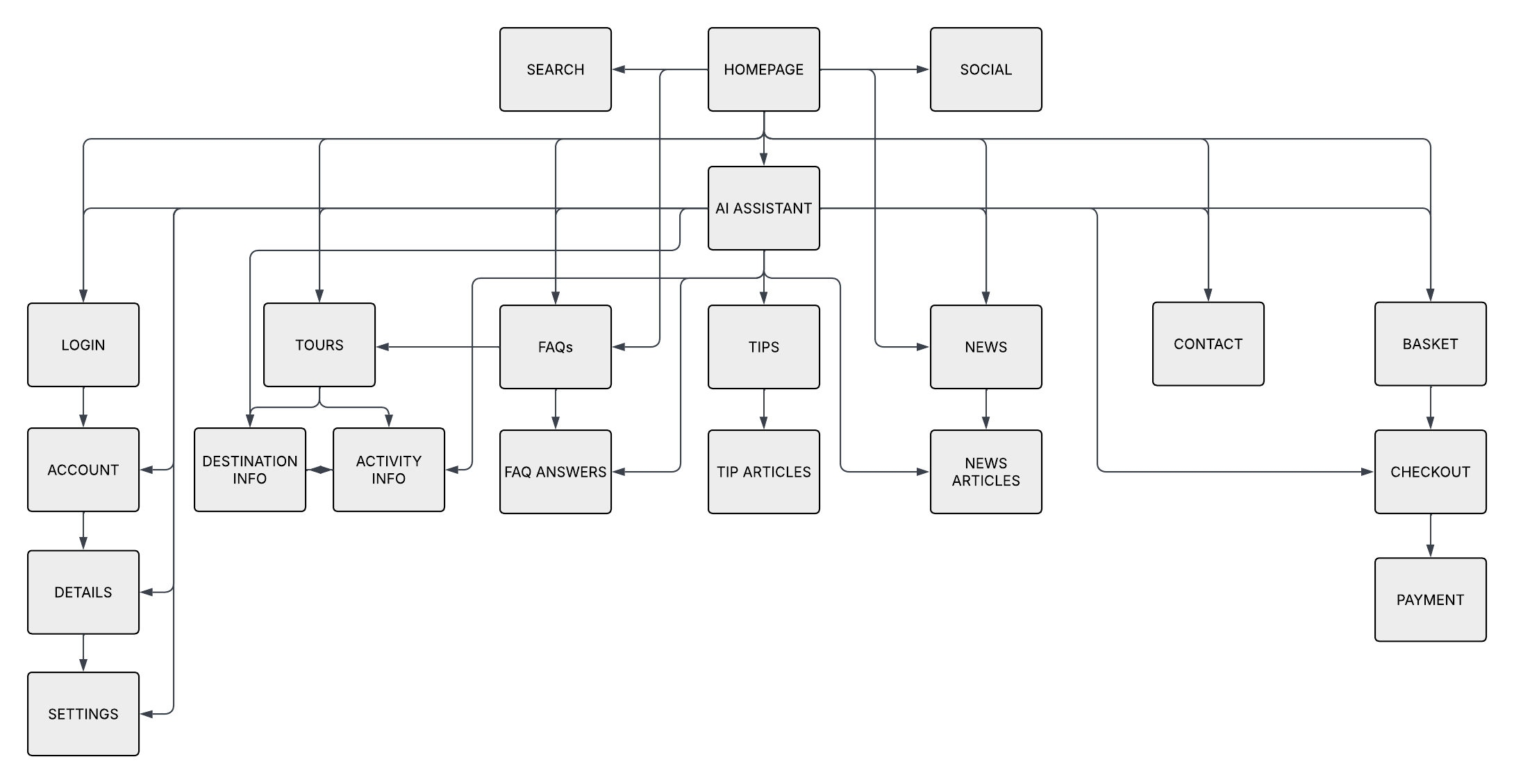 The AI assistant was scoped as a single, multi-intent conversational layer that replaces the fragmented interaction model established in the 2024 adventure tours site. Whereas the original design distributed responsibility across a quiz (guided discovery), chatbot (FAQs), and booking application (transactions), the 2025 assistant consolidates these into one continuous experience.