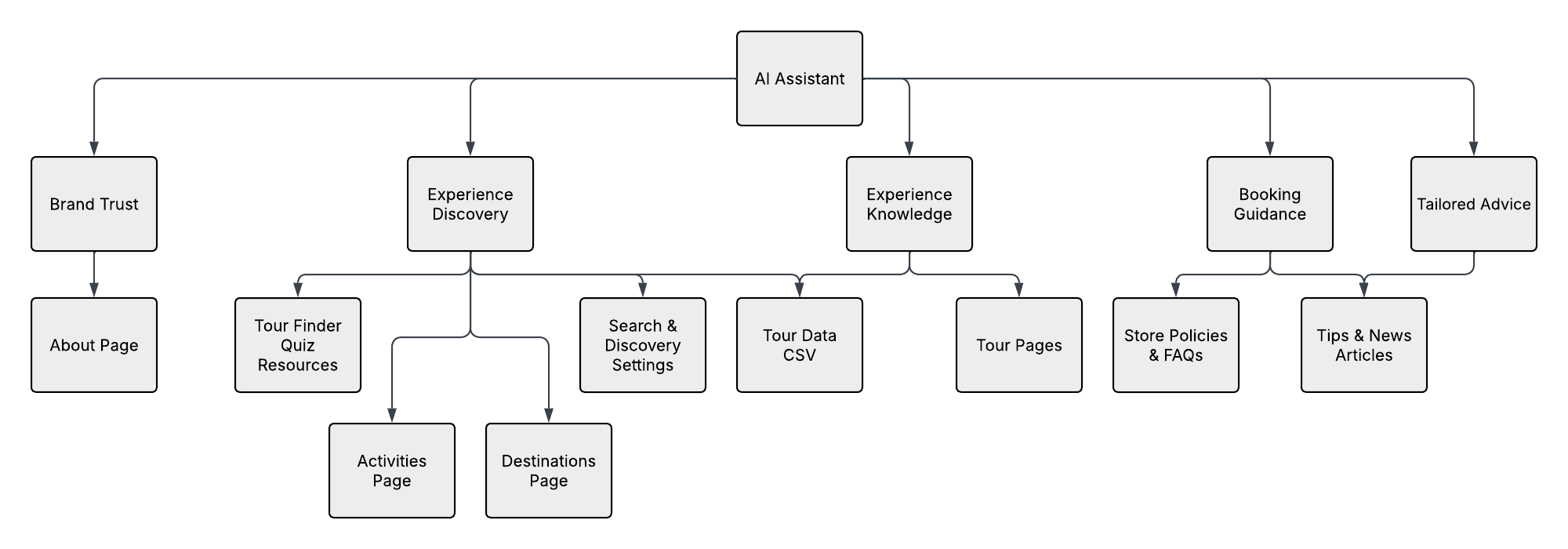 The assistant builds directly on the structured foundations established in the 2024 project. Tour data that was previously organised to support navigation, filtering, and recommendations was formalised into AI-retrievable structures covering activity type, location, experience level, seasonality, pricing, and availability. Content assets developed in 2024, such as FAQs, News & Tips, and tour descriptions, were refactored into a lightweight knowledge corpus aligned to conversational intent rather than page location. This continues the methodology where existing product data and editorial content were re-prepared for AI use rather than recreated. The result is a system where the quality of AI responses is directly traceable to prior information architecture decisions, reinforcing the principle that AI capability is constrained by data clarity, not model sophistication.