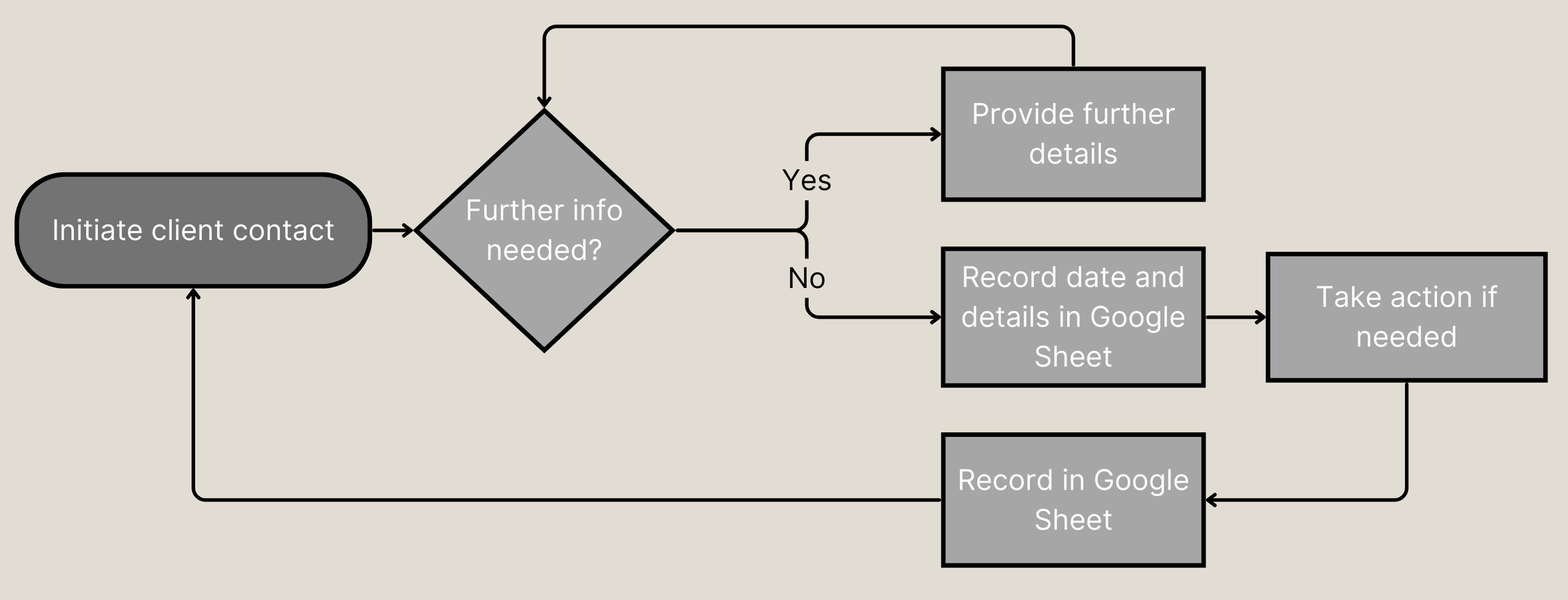 A set of Google Sheets accessed by the service coordination team on a daily basis was modified to provide a client contact scheduling function. A column was added to each Google Sheet recording the last contact date with the client, and colour-based conditional formatting added so that as the period since last contact approached 14 days, the service coordination team would be alerted and could take appropriate action, updating the Google Sheet when contact had been completed. This function could be better performed by a professional application such as a CRM, or a group email account for the business where reminders and calendar events are created to manage client communications. More ideally, a project portal could be implemented, as discussed below, for the client to access updates on-demand.