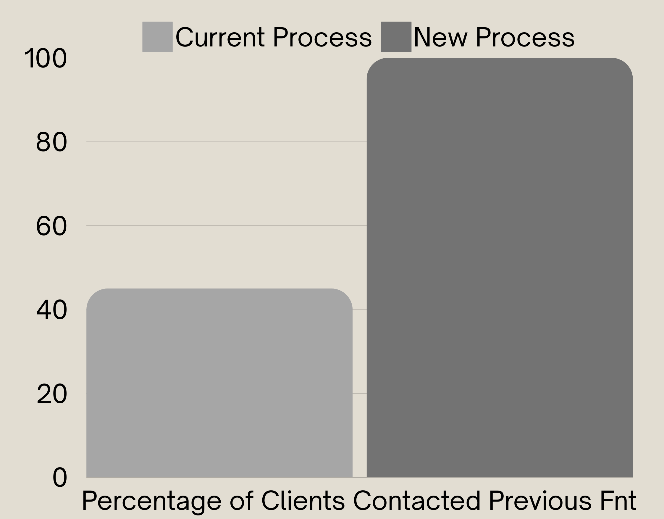 Aware of a verbal management request for fortnightly updating of clients at a minimum, an audit was undertaken of client phone call notes, emails, and formal client documentation such as contracts and design meeting notes. This revealed a group of clients who had not received any contact from the business in three to six months, a larger group who had not been contacted for one to three months, and a passive approach to client relationship management.