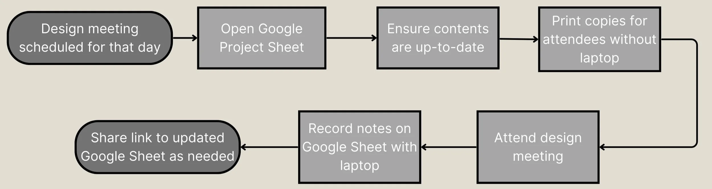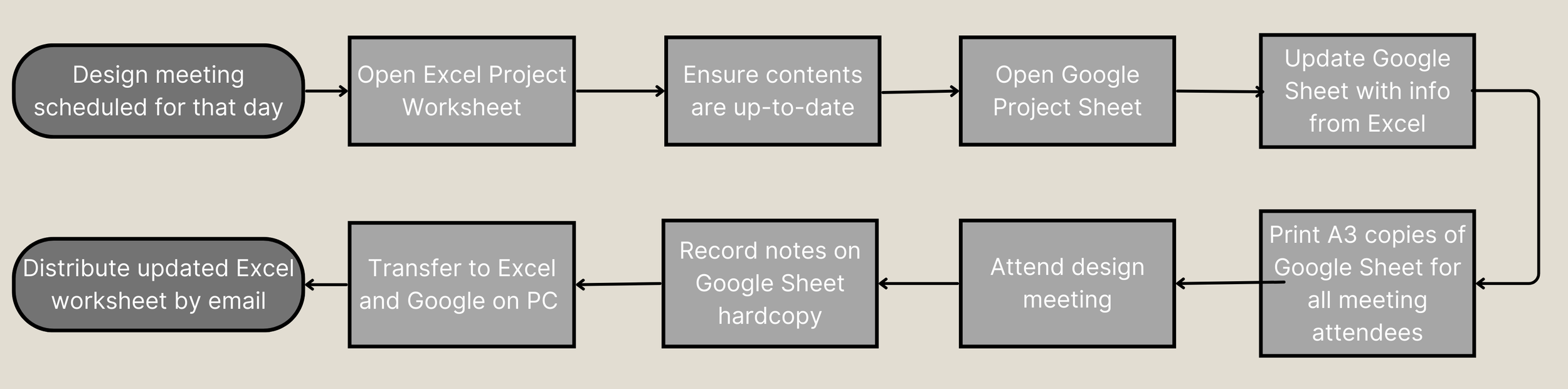 The business held weekly meetings with each member of the architectural design team to discuss progress towards their projects by the designer, service coordination team, and project team, barriers to further progress, and any additional support needed by the designer to get their work completed on time. The service coordination team would prepare this meeting by updating the relevant project register, printing copies of it for the team, and then making notes on the register as appropriate during the meeting. This project documentation was being maintained on both Windows and Google, entailing duplication of records and processes, making the preparation of each meeting an unnecessarily time-consuming process.