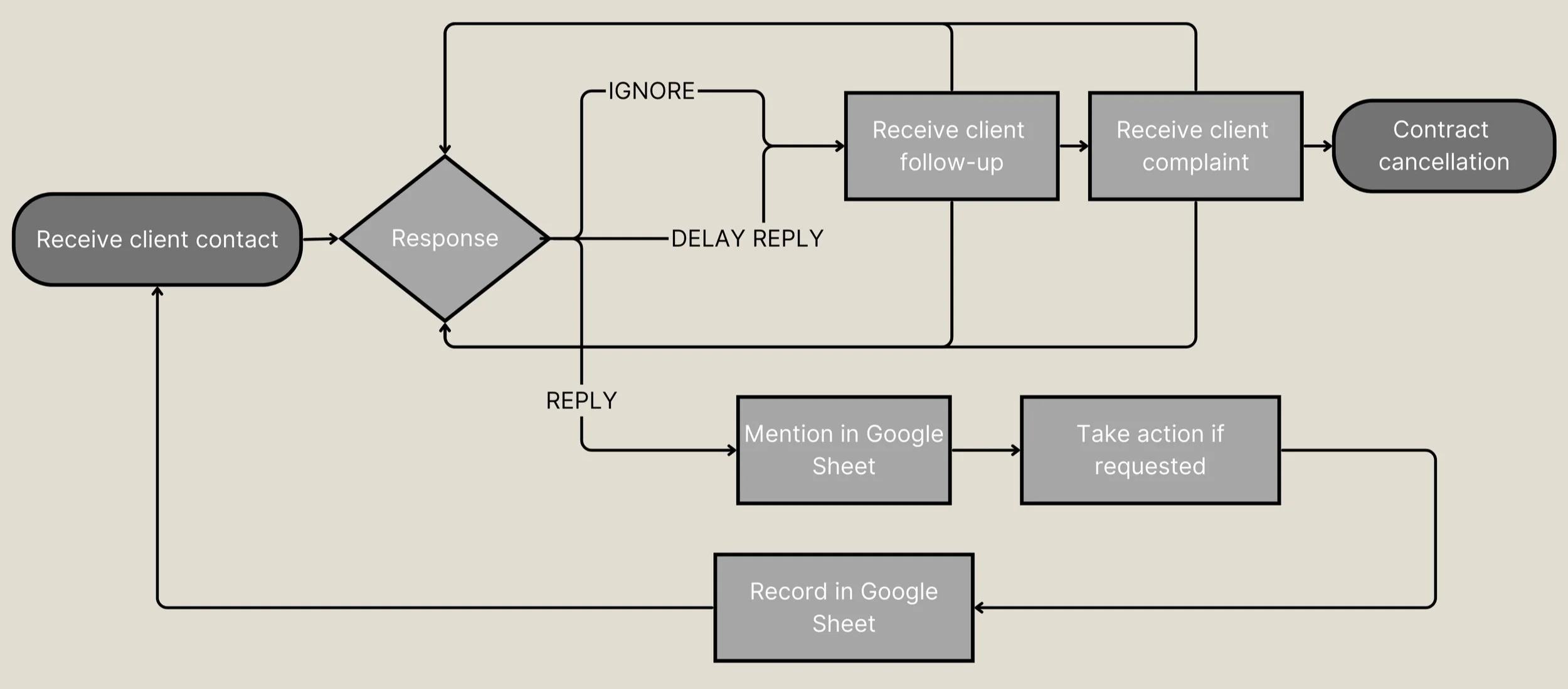 A short period of interaction with clients revealed dissatisfaction with communication from the business, including not receiving responses to enquiries, not receiving updates on development application or project progress, and inconsistent responses from staff to queries. Several client complaints had been received and a small number had cancelled their contract and/or left poor public reviews for the business.