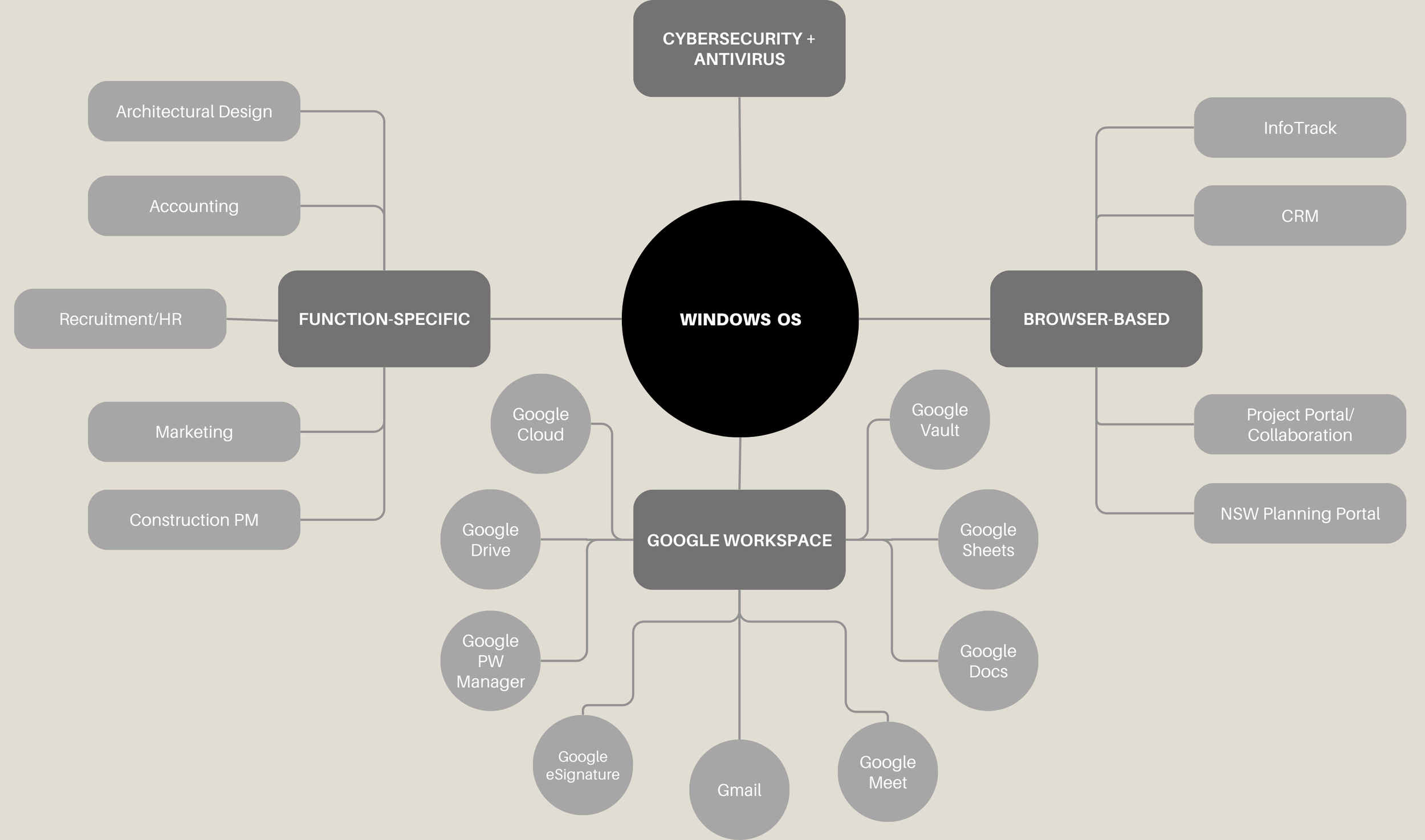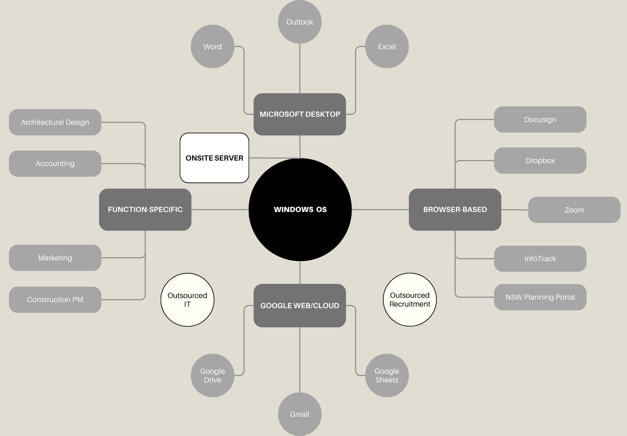 The existing system structure as mapped out at a high level here provided global access for all users to Microsoft applications, service coordination team access to browser-based applications, and access for the design, accounting, marketing, and project management teams to their own Google Sheets and function-specific programs.