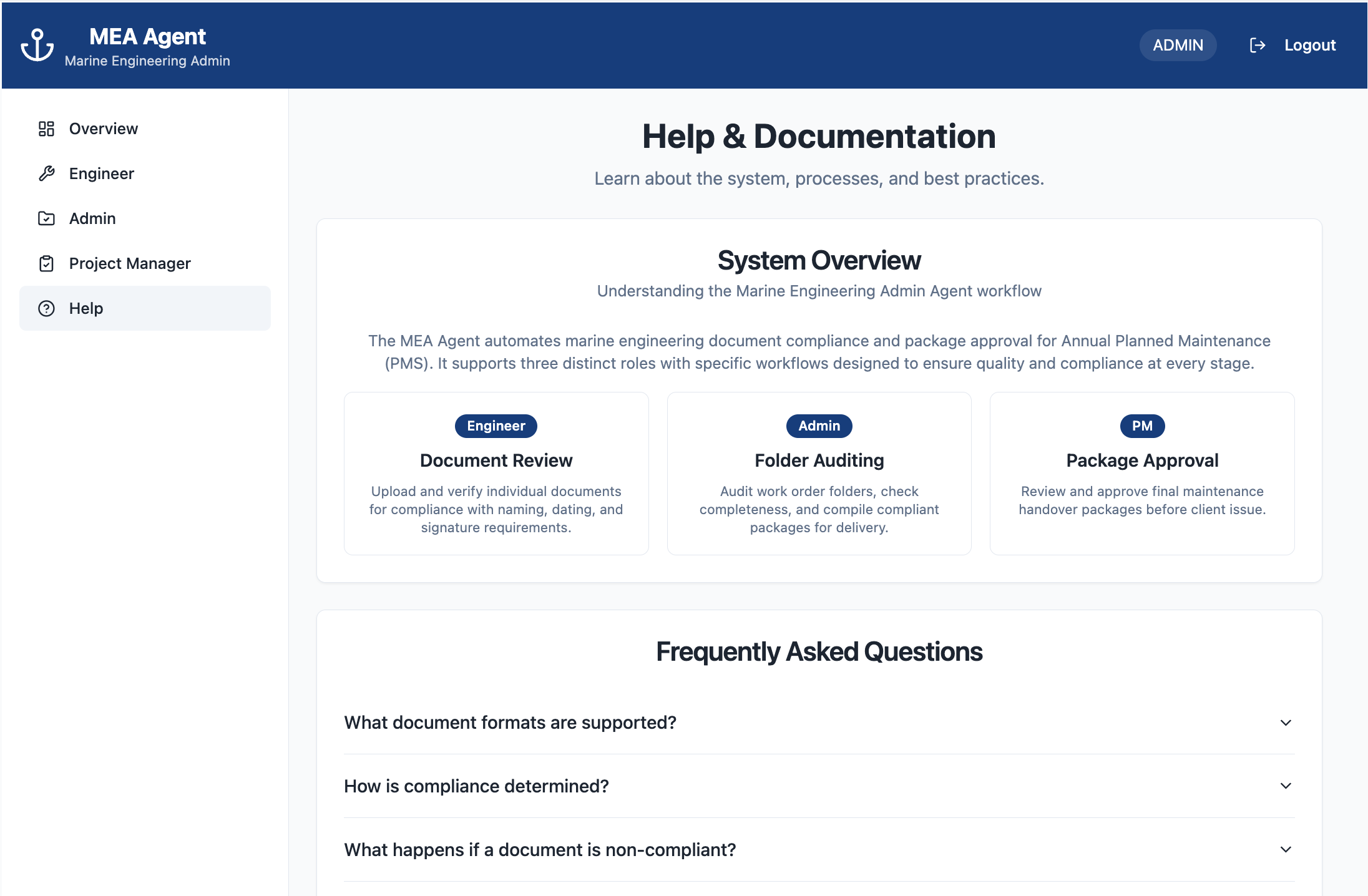 The engineering admin agent was designed as a role-aware, compliance-focused assistant that augments rather than replaces human decision-making across engineering handover workflows. Its scope is deliberately constrained to high-impact, low-judgement tasks: validating document compliance, checking handover package completeness, and surfacing risks early. For engineers, the agent provides immediate feedback during document preparation. For administrators, it performs consistent, repeatable compliance audits and package compilation. For project managers, it presents a consolidated view of readiness and outstanding issues to support approval decisions. This scoped design reflects lessons from the 2024 project, where efficiency gains plateaued due to reliance on tacit knowledge and manual checking, and aligns with best-practice guidance for safe AI use in high-risk professional settings.