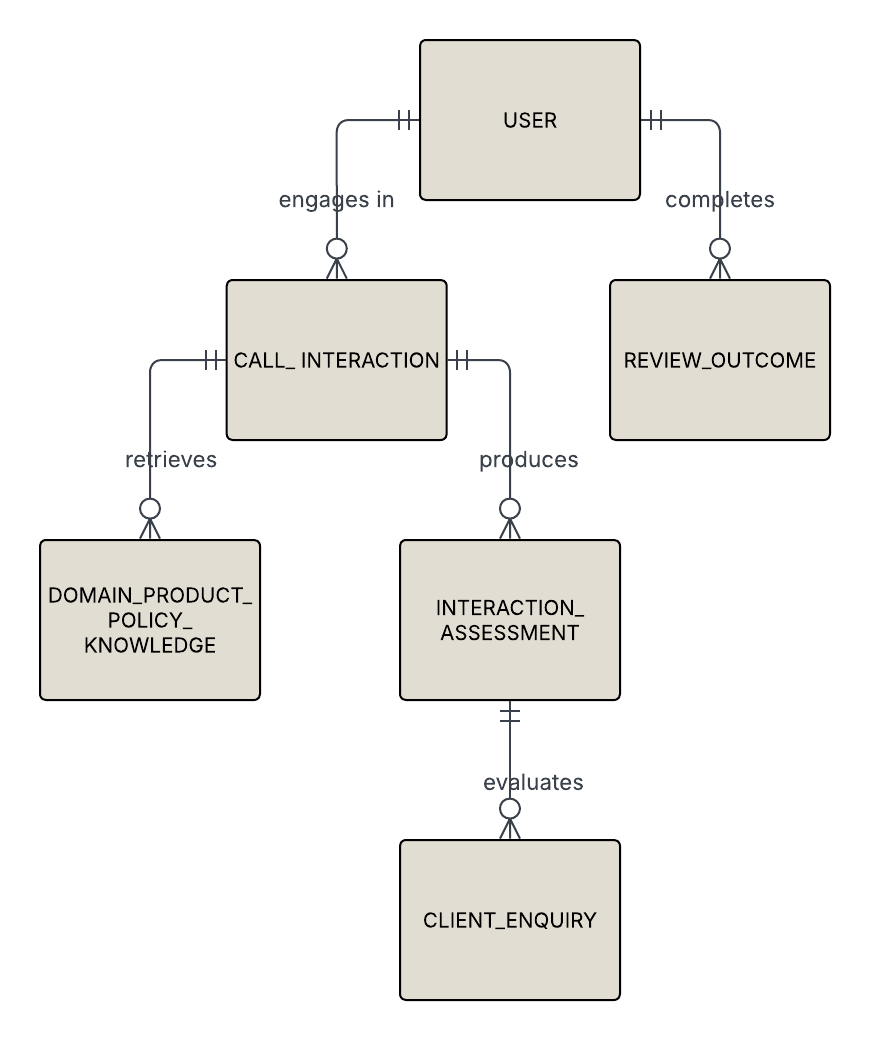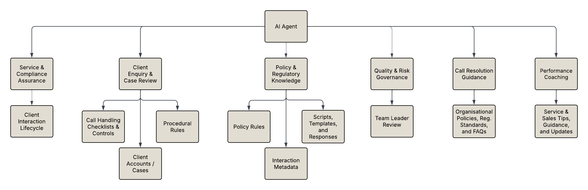 Data and knowledge preparation formalises assets that were previously implicit or fragmented across the 2024 prototypes. Core entities, such as enquiry type, knowledge topic, compliance requirement, and value-add trigger, are explicitly modelled to ensure deterministic and auditable agent behaviour.