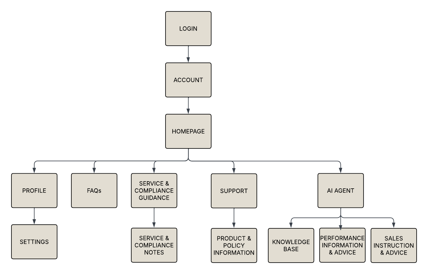 Knowledge content is structured hierarchically by topic sensitivity, with each node mapped to required actions including factual response, disclaimer insertion, referral, or escalation. This approach evolves the earlier FAQ and staff knowledgebase work into a governed system suitable for real-time use. By externalising knowledge rules and boundaries, the design ensures consistency, reduces compliance risk, and enables future maintenance without redesigning the interaction layer.
