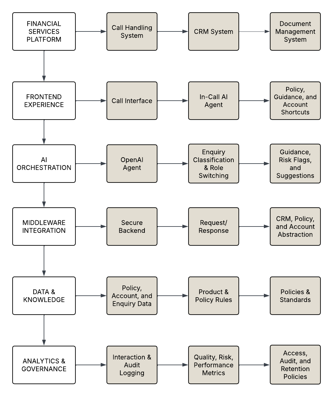 From a technical perspective, the solution consolidates previously separate tools into a single integration layer that can sit alongside existing contact centre systems. While the 2024 work focused on feasibility within third-party platforms, the 2025 design abstracts the agent logic from any single vendor, enabling portability and future extensibility.
