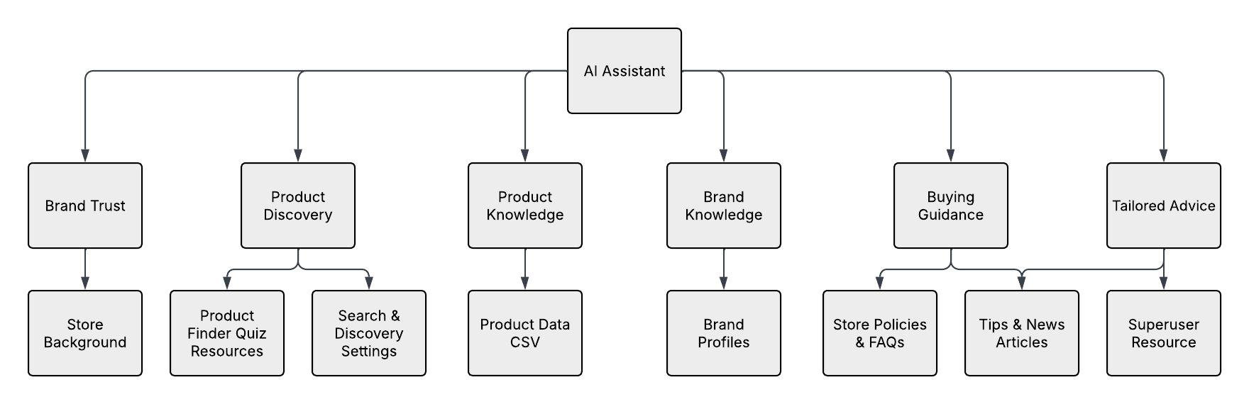In addition to product data, supporting knowledge files were prepared, including FAQs, device optimisation guides, and summaries of curated technology news articles. This mirrored the educational intent of the original store design while enabling conversational access to the same information. The result is a coherent knowledge layer that aligns website content, assistant responses, and discovery logic without duplication or contradiction.