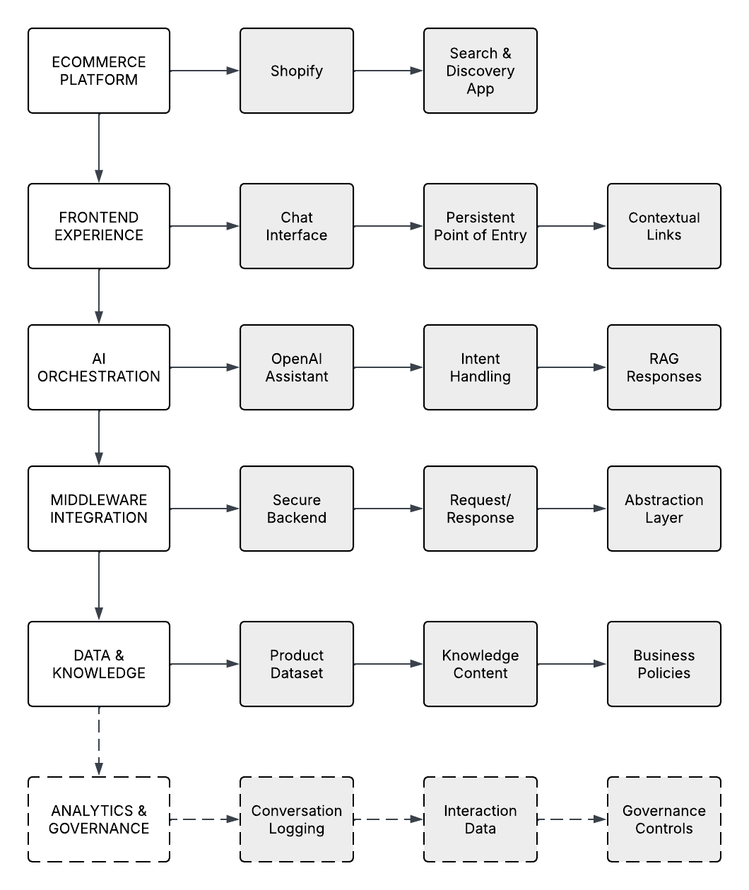 The 2025 strategy was informed by McKinsey (2025), Accenture (2024), Deloitte (2024a, 2024b, and 2024c), and Shopify (2025), with a deliberate emphasis on pragmatic, near-term AI adoption rather than speculative autonomy. Three principles guided the design. First, the assistant was positioned explicitly as an assistant rather than an autonomous agent, providing guidance and recommendations without executing transactions independently. Second, the design prioritised clean, structured first-party data, recognising that recommendation quality is constrained by data quality and semantic consistency. Third, the project focused on creating a retailer-owned conversational experience, reducing reliance on third-party AI ecosystems and preserving direct customer relationships.