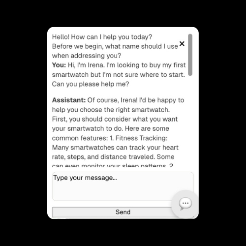 “As a previous smartwatch owner, I want to chat on the seller's website to quickly find a smartwatch that meets my specific needs and preferences, so that I can make an informed purchase without spending too much time browsing.”